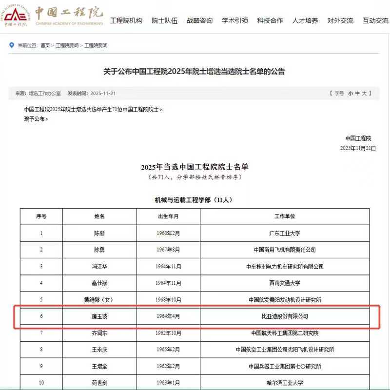 比亞迪集團(tuán)首席科學(xué)家廉玉波當(dāng)選中國(guó)工程院院士
