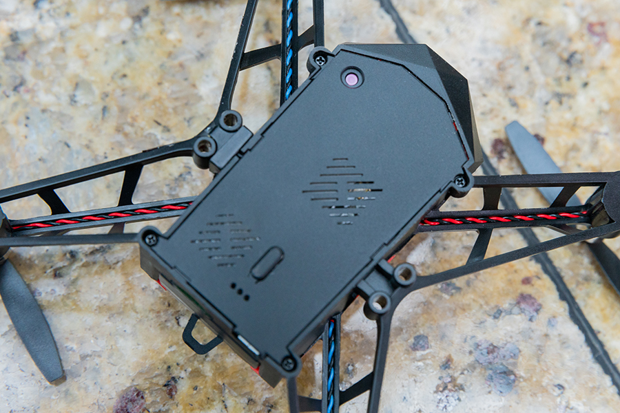 開機(jī)按鍵位于機(jī)身的底部,底部還有一個開機(jī)的信號指示燈和柵格散熱孔。在頂部的部位內(nèi)置了視覺定位傳感器。意念功能就是通過這個定位傳感器實(shí)現(xiàn)相關(guān)功能。不過如果在一些地面反差較小的環(huán)境下這個定位傳感器可能會失效,所以飛行地點(diǎn)還是要慎重選擇。