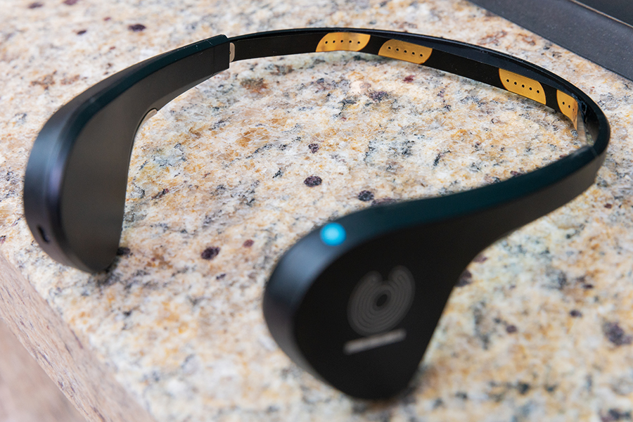 介紹完UDrone無人機(jī),現(xiàn)在來看一下UDrone意念機(jī),意念機(jī)是類似頭箍的設(shè)計,它同樣是PVC材質(zhì)打造而成,意念機(jī)的頭圍可有實(shí)現(xiàn)50cm至70cm的范圍調(diào)節(jié)。整個意念機(jī)內(nèi)置了6個傳感電極,其中4個位于前額部分,另外左右耳掛金屬也各有1個。