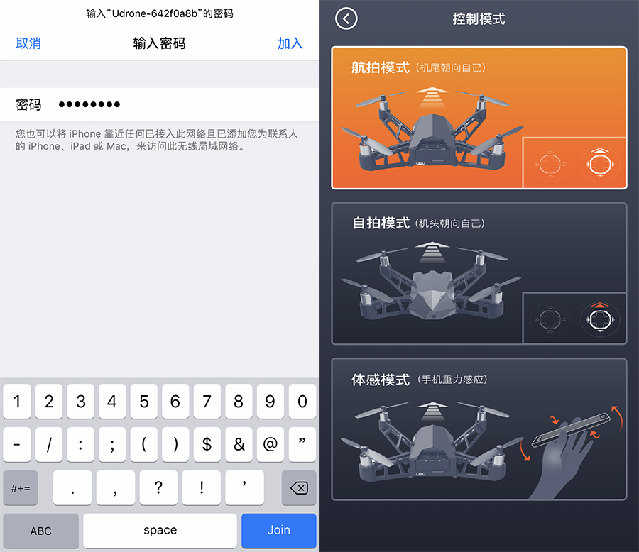 現(xiàn)在就開啟正式的飛行之旅吧,在移動設(shè)備上安裝UDrone應(yīng)用程序。將手機(jī)的Wi-Fi連接到無人機(jī)后就可開始飛行了。除了意念操控之外,常規(guī)的手機(jī)遙控飛行也是支持的,標(biāo)準(zhǔn)的美國手操控界面,無人機(jī)在起飛后會自動懸停在1.2米的高度等待用戶的后續(xù)操作。并且在航拍模式外,還支持自拍模式和體感模式的操控。