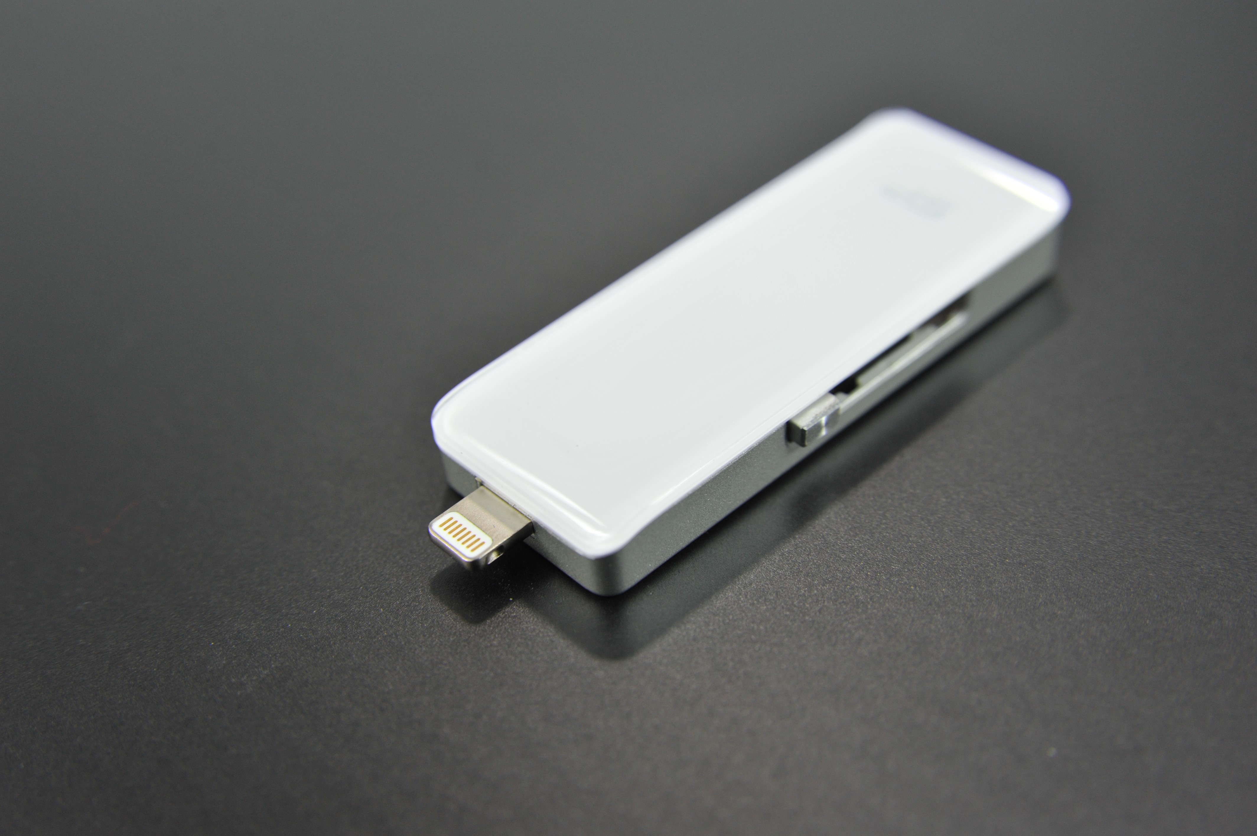產品采用無蓋滑推式USB接頭設計,只需摁住外殼側面上的小按鈕推動,便能隨意切換,推到一頭是Lightning接口,另一頭是標準USB3.0接口,而按鈕在中間則兩頭收縮,省去帽蓋遺失的麻煩,同時有效預防接頭受損。