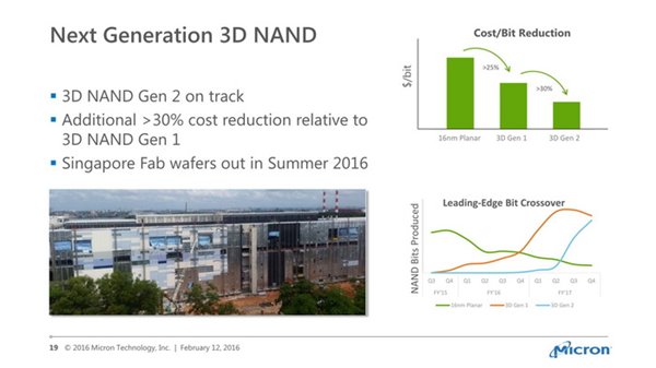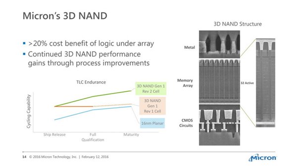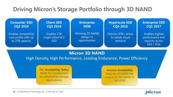 如果你對SSD還停留在容量小的印象中,那么你就out了。想提高SSD的容量、降低成本?那么從平面NAND轉向 3D NAND已經是大勢所趨。在行業中,三星是最先量產3D NAND的,東芝/閃迪、Intel等都已經進入,不過對于美光,就有點跟不上步伐了。不過不要緊,因為美光已經緩過神來了,不僅有顯存市場的GDDR5X之外,美光日前終于公布了自己的3D NAND閃存的路線圖。不出意外的話,在今年Q2季度,美光的2TB SSD硬盤就將面世,而在Q4季度美光的大招才會開啟——推出8TB的SSD(面向超大規模云服務市場)。