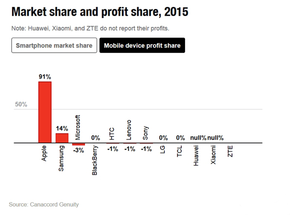 一直以來,蘋果公司就以其強大的“吸金”能力讓其它眾多手機廠商羨慕嫉妒恨,而最近一份來自《財富》雜志的數據顯示,2015年的蘋果吸金能力依然令人瞠目結舌。根據數據,蘋果又一次傲居群雄,獨占了智能手機市場91%的利潤。