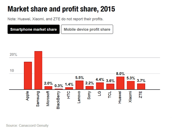 不過對于廠商而言,利潤率才是它們最關心的。三星的利潤占比為14%,而其它廠商如HTC、微軟、索尼、聯想等廠商手機業務都是處于虧損狀態。也就說,2015年只有蘋果和三星手機業務實現了盈利,而其它廠商基本處于“賠錢賺吆喝”的尷尬境地。