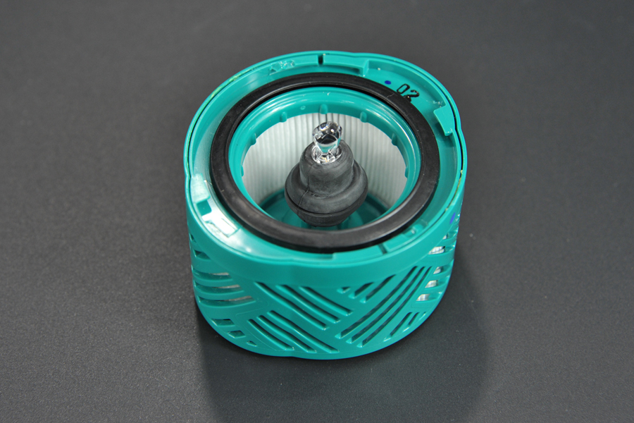 雙層放射式氣旋(左圖),通過強大的離心力把灰塵留在集塵桶中,氣旋中央的空氣則通過濾網(右圖)過濾,避免二次污染,濾網也可以直接水洗,十分省事