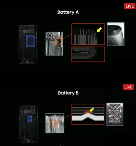 調查結果為:導致Galaxy Note 7自燃的原因,是其配備的電池在設計和制造中存在問題。實驗室分析的結果顯示,第一批次的電池在右上角出現了擠壓受損的現象,第二批次電池正極焊接有毛刺,刺穿電池導致短路起火。