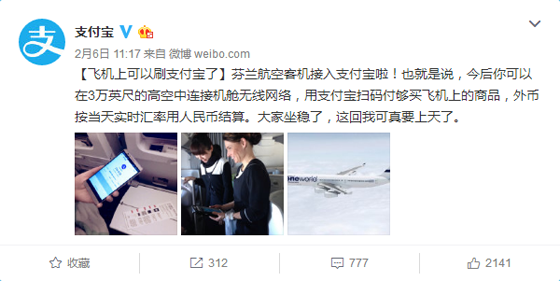 昨日,支付寶正式對外宣布,芬蘭航空客機接入支付寶,“用戶可以在3萬英尺的高空中連接機艙無線網絡,用支付寶掃碼付購買飛機上的商品,外幣按當天實時匯率用人民幣結算。”