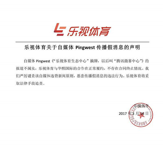 很快,第二天樂視體育發表名為關于自媒體Pingwest傳播假消息的聲明,譴責該自媒體違背新聞原則,惡意散播假消息,并要采取法律手段追責。在聲明中樂視解釋說樂視正常履行合約,不存在合同終止的情況,暗示樂視體育中心不會被摘牌。