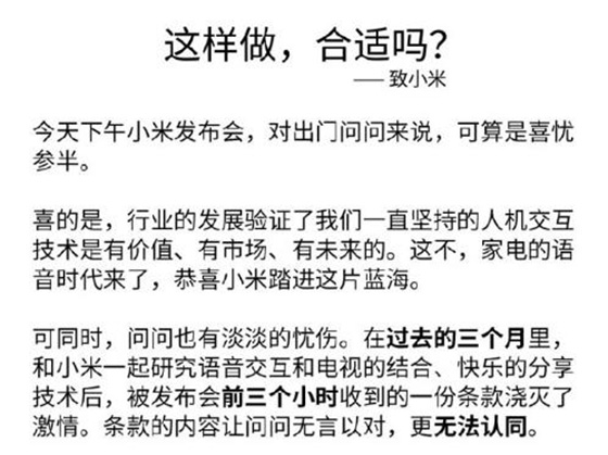 原來是小米電視4A的人機交互技術是出門問問與小米一起研究的成果,而在小米電視4A的發布會上對于出門問問這個合作伙伴的付出卻只字未提,引起了出門問問不滿,于是發微博要求小米解釋清楚。