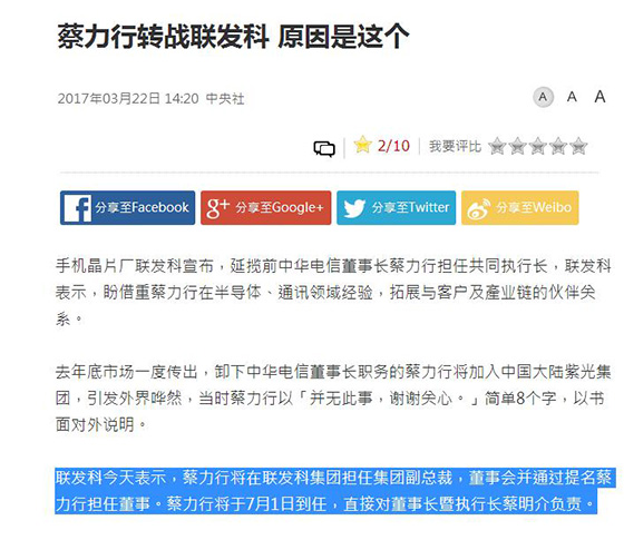于是乎就有了今天臺灣中央社的報道:前中華電信董事長蔡力行加盟聯發科并擔任執行長。聯發科表示,蔡力行將在聯發科集團擔任集團副總裁,董事會并通過提名蔡力行擔任董事,蔡力行將于7月1日到任,直接對董事長暨執行長蔡明介負責。