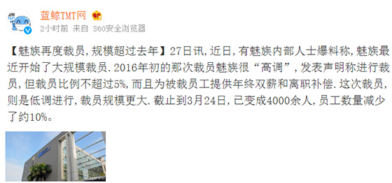 據藍鯨TMT網微博爆料,國內手機廠商魅族繼去年年初進行了幅度不超過5%的裁員之后,最近又進行了一次的裁員,這次的裁員幅度不僅規模大而且還很低調,截止到3月24日,已變成4000余人,員工數量減少了約10%。
