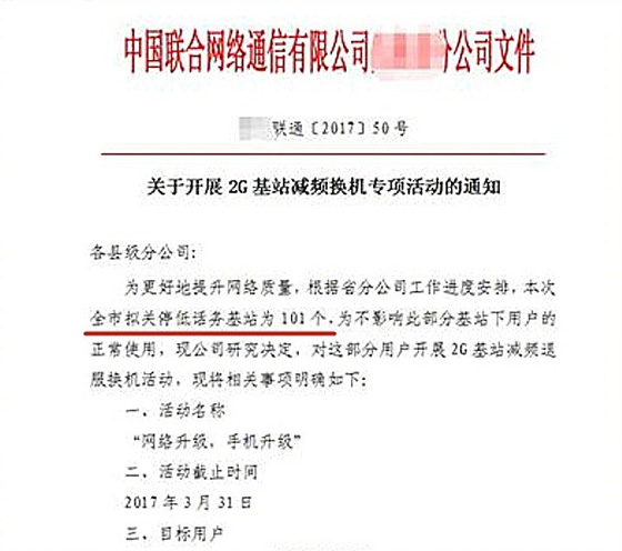據媒體爆料,來自中國聯通某一分公司的文件顯示,為了增加4G網絡的用戶量,聯通高層決定關停低話務基站,為了不影響用戶的體驗,決定開展2G基站減頻退服的換機活動,截止日期為3月31日。