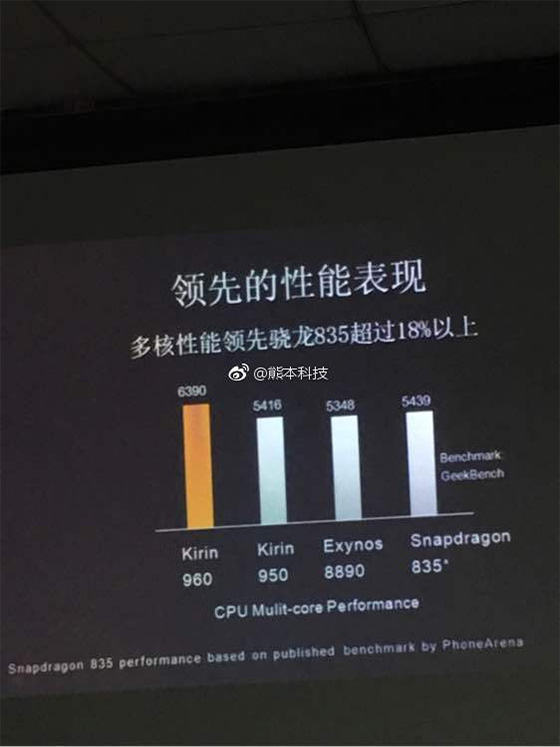 以上的對于我們手機發燒友來說,能夠忍受,讓人受不了的是一張麒麟960性能暴打高通驍龍835的文案,不知道是文案制作者的無知還是有意而為之,麒麟960的多核性能跑分居然遠超高通驍龍835高達18%,麒麟960這是要超神的節奏,高通的驍龍835再差也不能差到這地步。