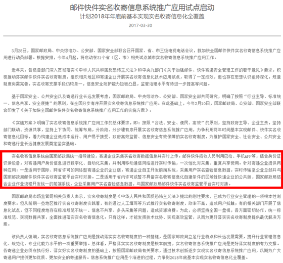 日前,國家郵政局已發(fā)文稱,將于4月起,在全國31個省份開始試點(diǎn)實(shí)名收寄信息系統(tǒng)推廣工作。文件中提到兩個關(guān)鍵點(diǎn):一是實(shí)名收寄制,二是用戶身份信息數(shù)字化。