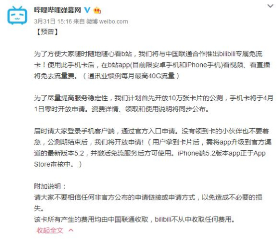 昨天知名二次元彈幕分享網(wǎng)站嗶哩嗶哩發(fā)微博宣布將與中國(guó)聯(lián)通合作推出bilibili專屬免流卡!使用此手機(jī)卡后,在b站app(目前限安卓手機(jī)和iPhone手機(jī))看視頻、看直播將免去流量費(fèi)。(通訊業(yè)慣例每月最高40G流量)首批開(kāi)放10萬(wàn)張卡片的公測(cè),手機(jī)卡將于4月1日零時(shí)開(kāi)放申請(qǐng)。