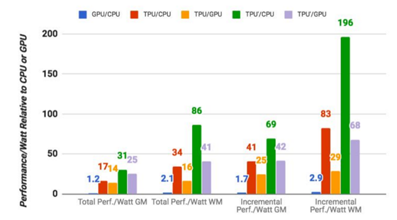 其實(shí),如果對(duì)這方面感興趣,在谷歌論文(Google's paper)中是可以找到關(guān)于TPU的一些運(yùn)作細(xì)節(jié)的。盡管如此,谷歌自身的基準(zhǔn)測(cè)試結(jié)果,依然聚集了整個(gè)行業(yè)的目光。這一結(jié)果為谷歌評(píng)估自己的芯片,以此為前提,谷歌的公布的情況為:TPU在執(zhí)行谷歌常規(guī)的機(jī)器學(xué)習(xí)工作負(fù)載方面,相較于一個(gè)標(biāo)準(zhǔn)的CPU/GPU組合,Intel Haswell CPU搭配Nvidia K80 GPU,平均要高出15倍至30倍之多。更重要的是,TPU的每瓦特性能(TeraOps/瓦特)達(dá)到了一般CPU/GPU組合的30倍至80倍,如果采用了新的內(nèi)存,這一數(shù)值還將更高。