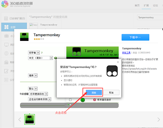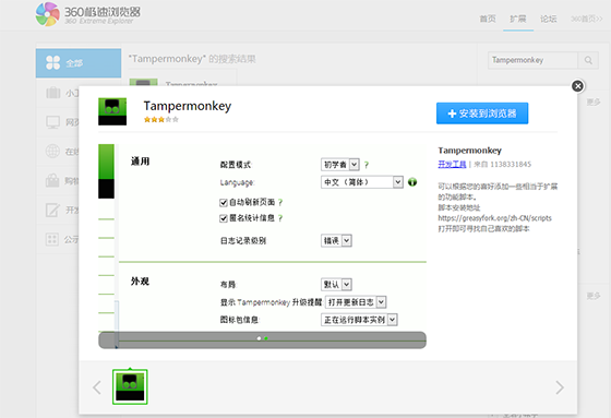 1.下載Tampermonkey:進入360極速瀏覽器擴展中心搜索Tampermonkey,點擊安裝到瀏覽器。(推薦國內用戶選擇此途徑,方便快捷),Tampermonkey所在的360極速瀏覽器擴展中心地址:https://ext.chrome.360.cn/webstore/search/Tampermonkey