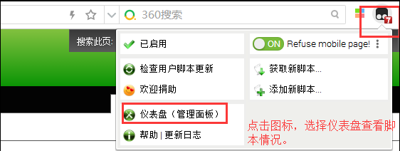 3.查看腳本:可能有人還是不放心,腳本的安裝情況,可以點擊Tampermonkey圖標,選擇儀表盤(管理面板)查看腳本情況