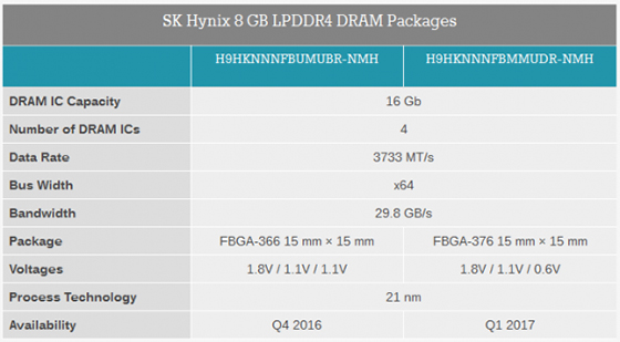 此后老對(duì)手SK海力士于12月宣布推出8GB LPDDR4內(nèi)存與三星針?shù)h相對(duì),與三星不同的是SK海力士的8GB LPDDR4內(nèi)存將有366 ball與376 ball兩種規(guī)格。其中366 ball可以與SOC或是UFS疊在一起,現(xiàn)已開(kāi)始出貨;376 ball將會(huì)在2017年第一季開(kāi)始供應(yīng)。SK海力士的16Gb內(nèi)存使用的是21nm制程。