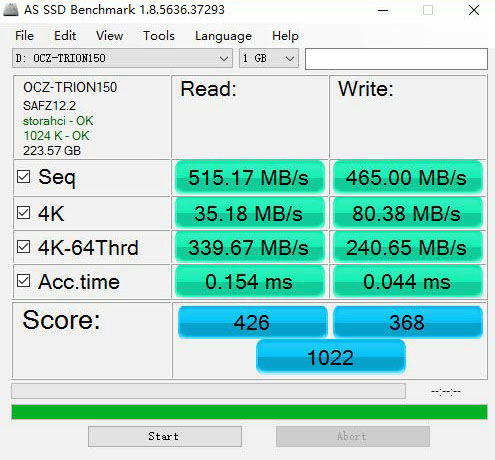 在AS SSD Benchmark測試中,連續讀取和寫入方面達到了515.17MB/s和465.00MB/s。它的4K讀取速度為35.18MB/s,寫入速度為80.08MB/s。這樣看起來數值還是相當不錯,比Trion 100的性能上有了一定的提高。