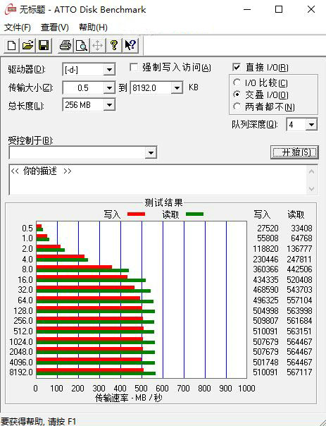 ATTO上的數據表明,OCZ TRION 150固態硬盤空盤最大讀取速度為567MB/s、最大寫入速度為510MB/s。