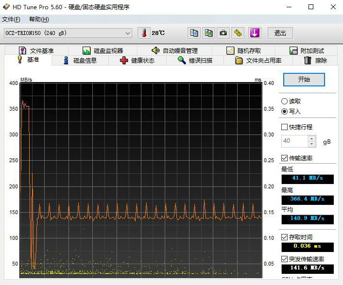 通過測試我們發現,這款OCZ TRION 150 240G固態硬盤的最低讀取速度為41.1MB/s,而最高讀取速度為366.4MB/s,平均速度為148.9MB/s,測試的曲線很穩定。