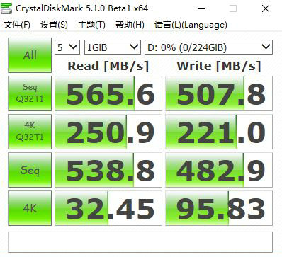 CrystaI Disk Mark的持續讀寫速度達到565 /507 MB/s,4K讀寫分別是32/95MB/s,對于入門級SSD已經是不低的數值了。