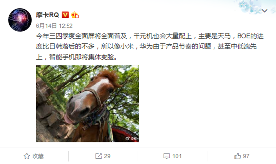 另一個知名數碼博主“摩卡RQ”也表示,由于供應鏈對全面屏的生產技術日趨成熟,很多品牌或將從中低端開始普及全面屏。