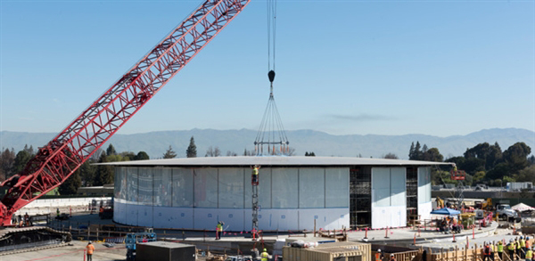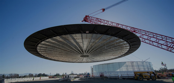 圖中展示了施工方吊頂的過程,屋頂采用的是碳纖維材質,同時還融合了鋼鋁。蘋果表示,屋頂是在迪拜設計和組裝完成然后運回美國,重達80噸,直徑45米左右,是同類建筑模塊中最大的。