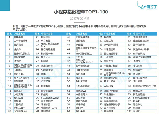 微信小程序推出已有8個月,可能有一部分人還沒有用到過微信的這一強大功能?;蛟S很多人想知道,微信小程序到底在哪些地方應用比較多?小程序都可以用來干嘛?近日,國內(nèi)統(tǒng)計平臺“阿拉丁”發(fā)布了首個微信小程序TOP100榜單,向大家展示了Q2季度各類微信小程序的使用情況。