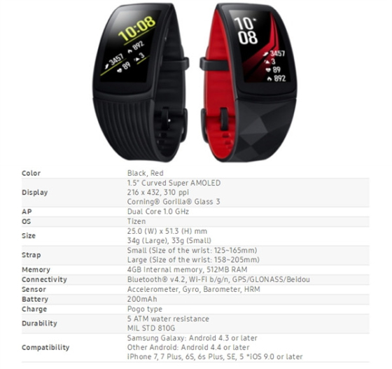 Gear Fit2 Pro擁有紅、黑兩種配色,采用1.5英寸216×432分辨率AMOLED顯示屏,搭載雙核1GHz處理器,512MB RAM+4GB ROM存儲搭配,電池容量200mAh,運行三星Tizen系統,支持藍牙4.2、Wi-Fi、GPS,支持在線Spotify和離線音樂,同樣擁有MID-STD-810G軍標認證,支持50米潛水和Speedo On。
