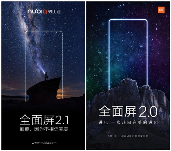 就在小米為MIX 2炒足了熱度、造足了勢頭的時候,國內另一家在屏幕技術上有所建樹的廠商——努比亞,今日在官微上發布了海報,無論從畫面還是文字都與小米MIX 2的海報針鋒相對,借勢造勢為新機預熱。