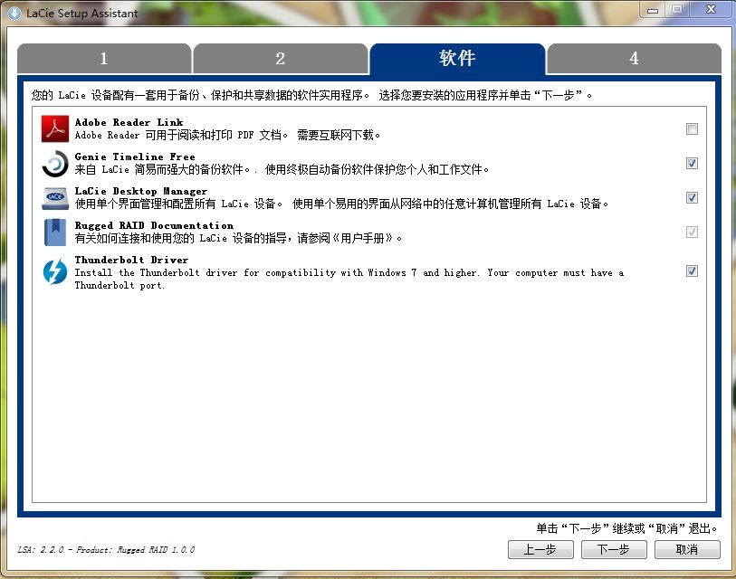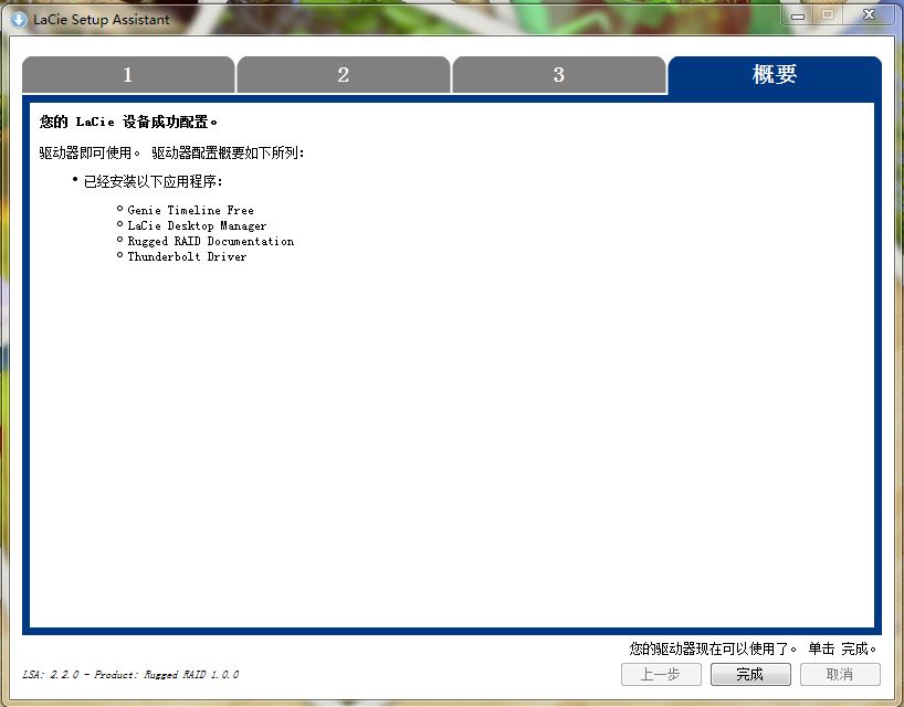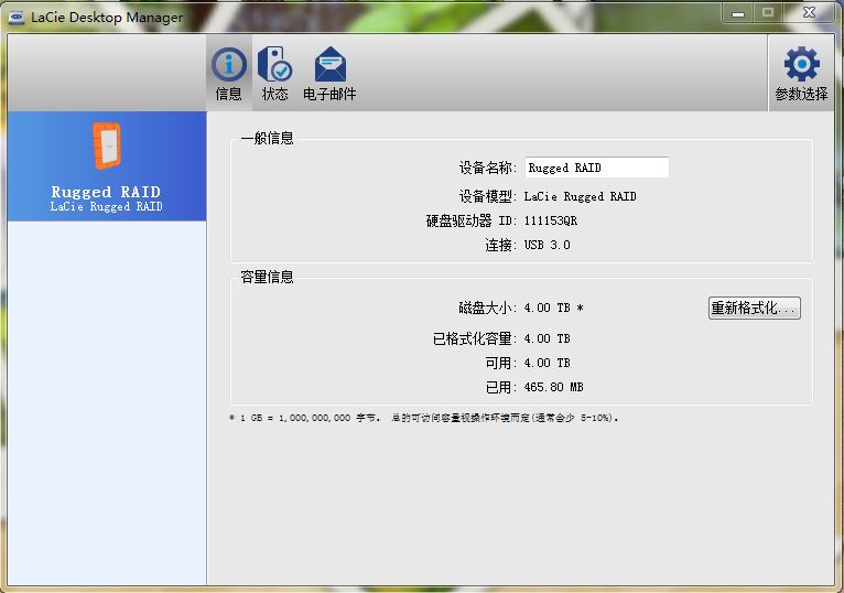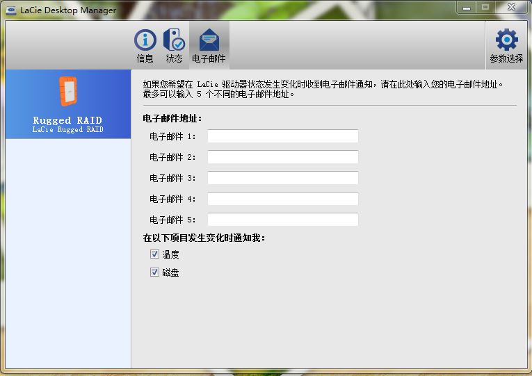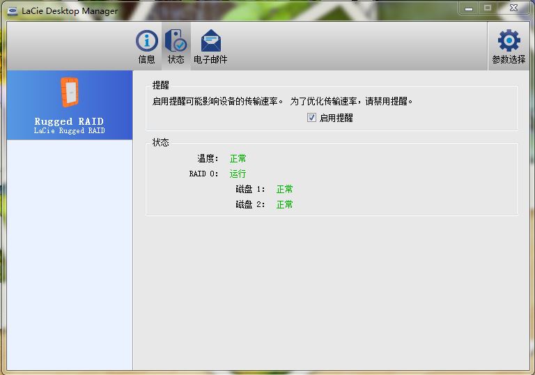 LaCie Rugged RAID作為定位于高端的存儲產(chǎn)品,LaCie還為其配置了軟件,在第一次使用的時候需要安裝,小編是在Windows平臺安裝了此驅(qū)動器。該軟件主要可以查看硬盤的事實(shí)狀態(tài),如提醒是否溫度過高、工作是否正常等。