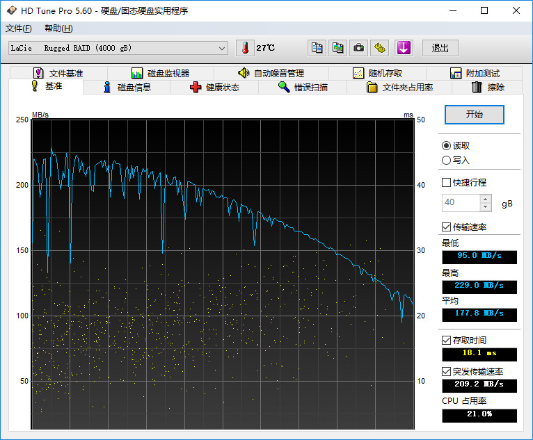 通過測試我們發(fā)現(xiàn),這款Rugged RAID的最低讀取速度為95MB/s,而最高讀取速度為229MB/s,平均速度為177.8MB/s,測試的曲線相對變化不大。