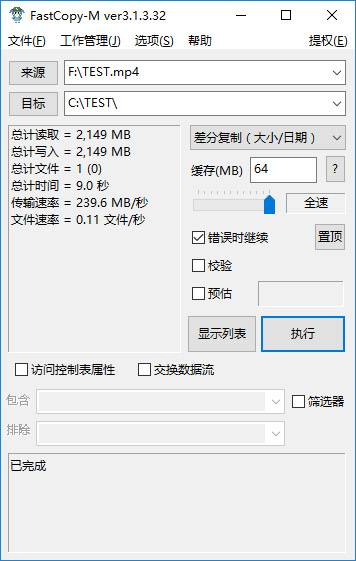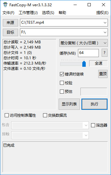 我們采用FastCopy來模擬真實(shí)讀寫操作,測試存儲設(shè)備的真實(shí)讀寫速度。通過對2G文件進(jìn)行復(fù)制寫入速度212.3MB/s,用時10.1秒。而從移動硬盤讀取出文件的速度為239.6MB/s,綜合讀寫速度相當(dāng)迅速,屬于理想水平。