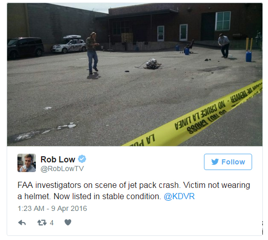 據(jù)悉,尼克是在丹佛市一家飲料公司附近試飛的,不想發(fā)生了悲劇,它佩戴的是一款過氧化氧噴氣背包,因?yàn)槭タ刂疲詮?米高空墜地發(fā)生意外。可謂作死。尼克現(xiàn)已出院。