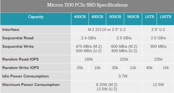 9100系列提供PCI-E 3.0 x4半高半長擴展卡、U.2 2.5寸兩種樣式,容量800GB、1.2TB、1.6TB、2.4TB、3.2TB,性能方面最高可達3GB/s持續(xù)讀取、2GB/s持續(xù)寫入、750000 IOPS隨機讀取、160000 IOPS隨機寫入;7100系列也有兩種樣式,M.2 22110的容量提供400GB、480GB、800GB、960GB,U.2 2.5寸的還有1.6TB、1.92TB。最高可達2.5GB/s持續(xù)讀取、900MB/s持續(xù)寫入、235000 IOPS隨機讀取、40000 IOPS隨機寫入,功耗最大12.5W。