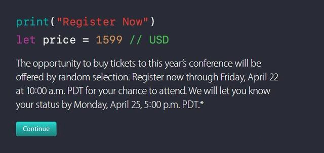 值得一提的是,這次蘋果的開發者頁面風格相當獨特,有種程序員寫代碼的感覺,風格也很復古,其中有一些細節值得我們注意。如本次WWDC 2016的門票價格為1599美元(約人民幣10353元),同時本次開發者大會的門票將會在開發者注冊后,照例采用隨機抽取(搖號)的形式確保公平。