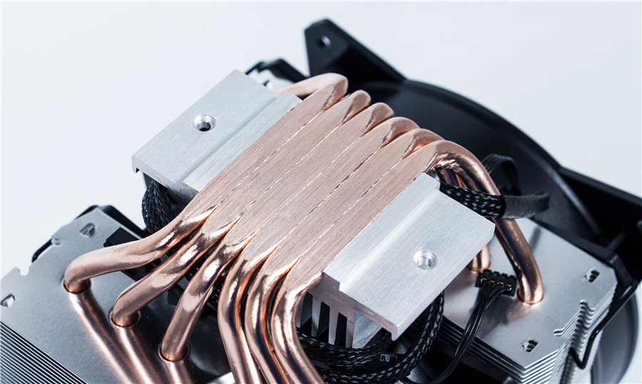 T620P RGB底座采用熱管直觸2.0技術,6根6mm銅質熱管直接接觸CPU表面,極大地增大了散熱面積。這一設計相比帶底座還有幾樣優點:1.降低了散熱器的高度,這點對于這個大家伙來說尤為重要;2.不鍍鎳更加環保。6根銅熱管通過穿Fin的方式與124片鋁質鰭片結合,被牢牢包裹,大大提高了散熱效率,能夠高效地導出熱量。