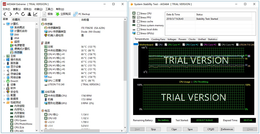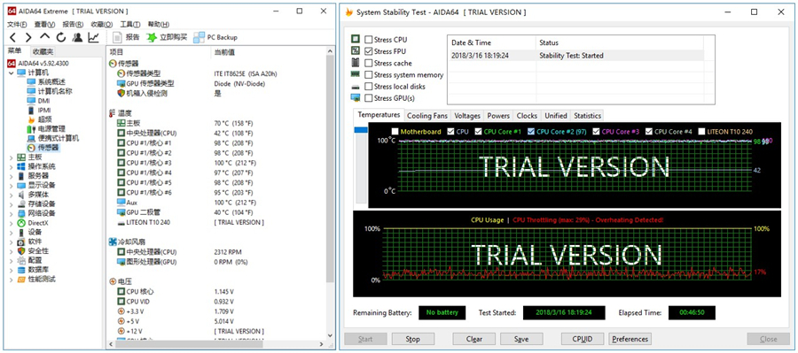 我們將i7-8700k睿頻至4.7GHz,使用最為常見的烤雞軟件AIDA64,單烤FPU,使CPU滿載半小時以上。在室溫27℃的情況下,測試效果如下: