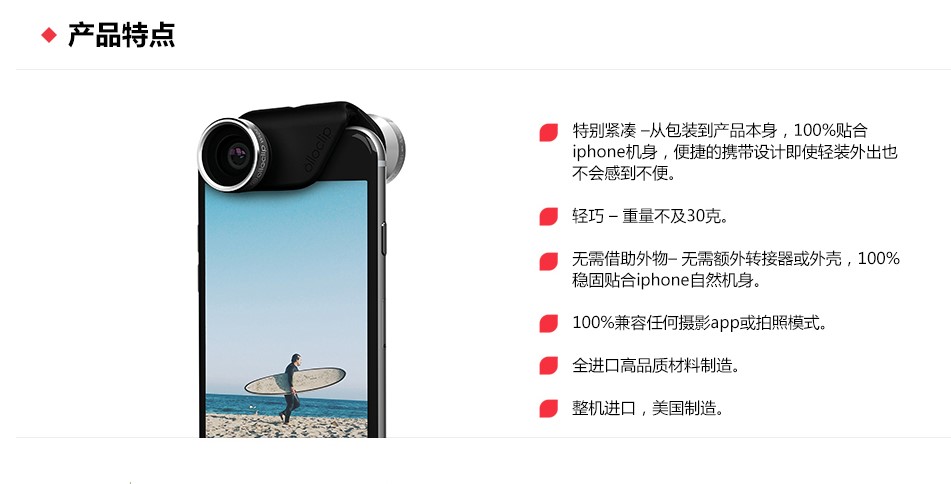 olloclip是手機攝影領域的開創者,毫無疑問是手機外設鏡頭產品中最成功的一個,以其美觀、小巧、安裝拆卸簡易著稱,提供的廣角、微距、魚眼鏡頭效果也都非常出色,獲得了用戶的好評。