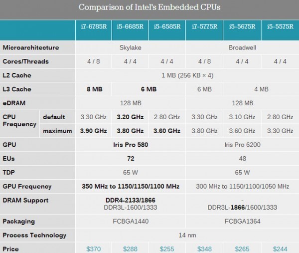 無獨(dú)有偶,Intel近日針對(duì)嵌入式市場(chǎng)也發(fā)布了新的R系列處理器,包括Core i7-6785R、Core i5-6685R、Core i5-6585R三款產(chǎn)品,都配備了Iris Pro 580核顯,擁有72個(gè)EU單元和128MB eDRAM。