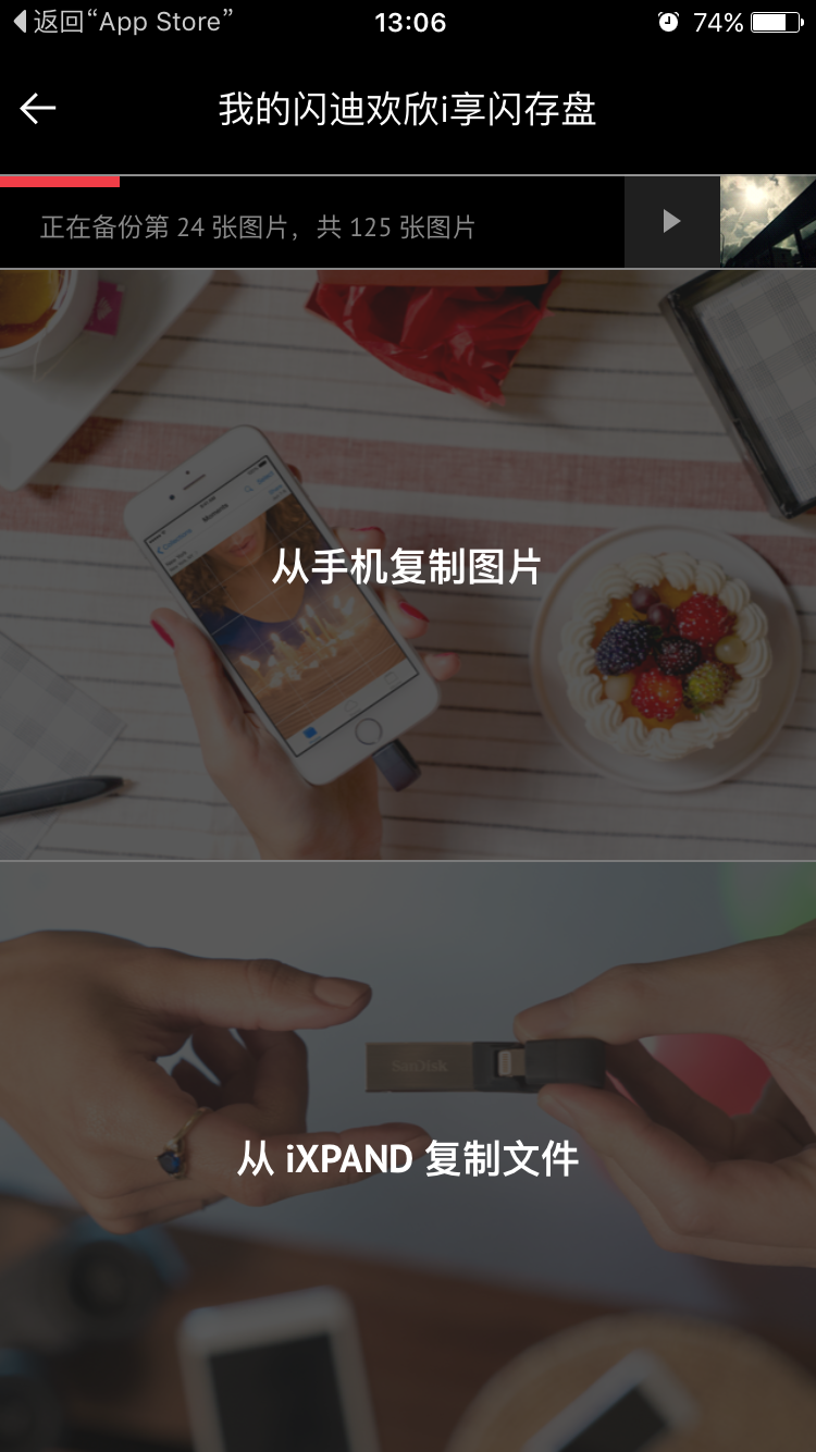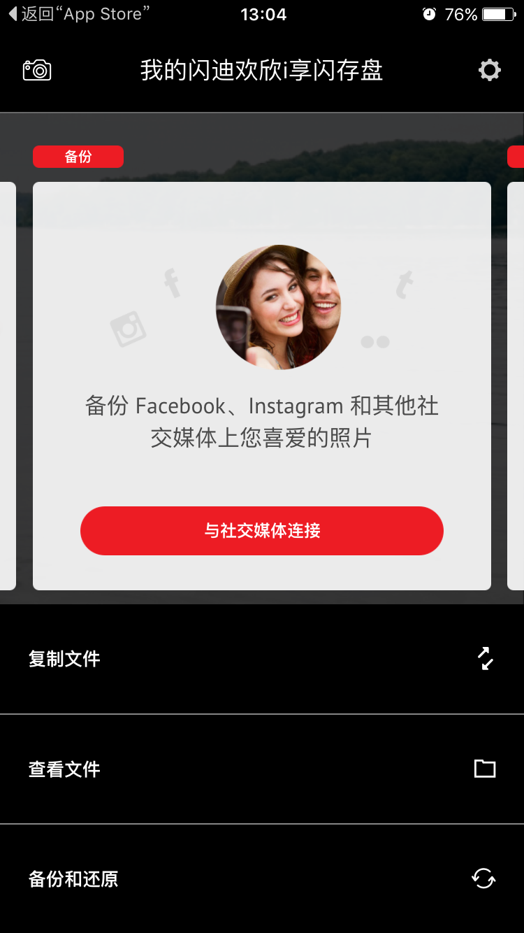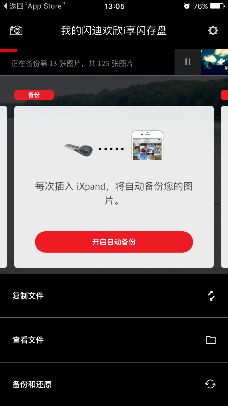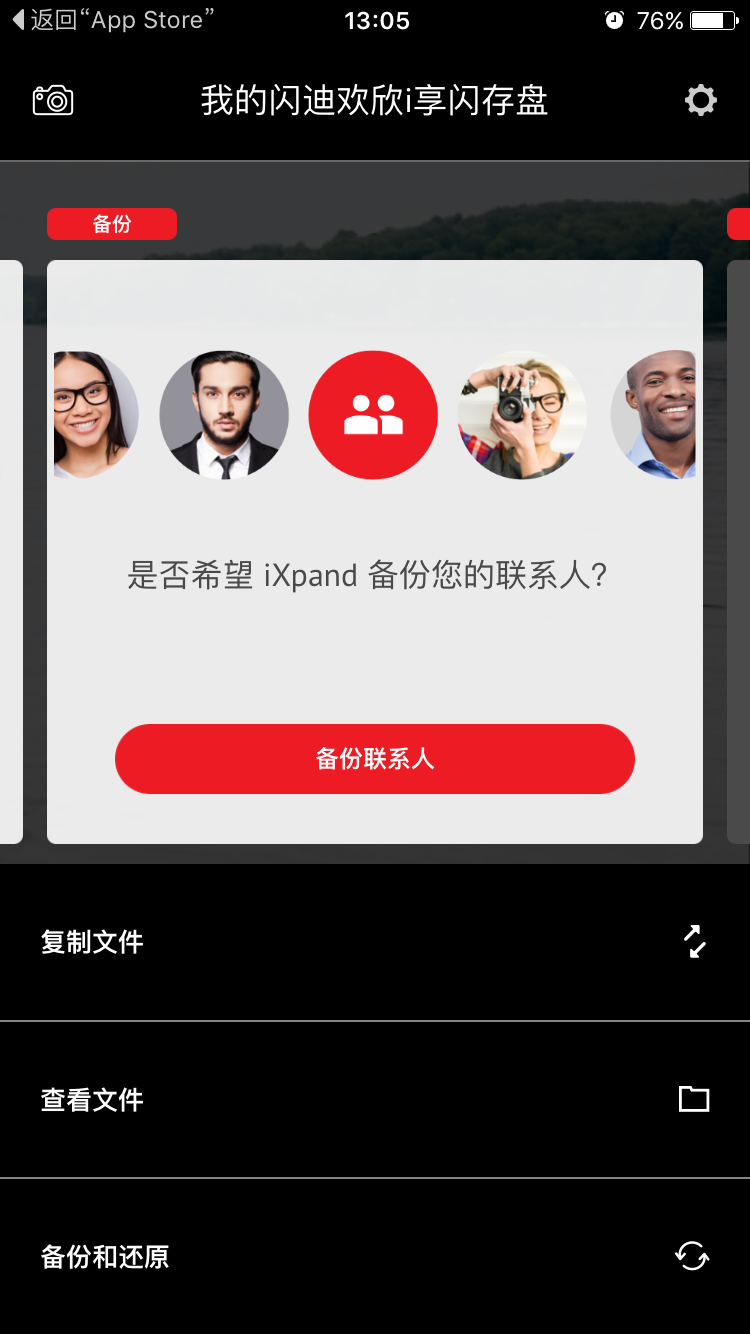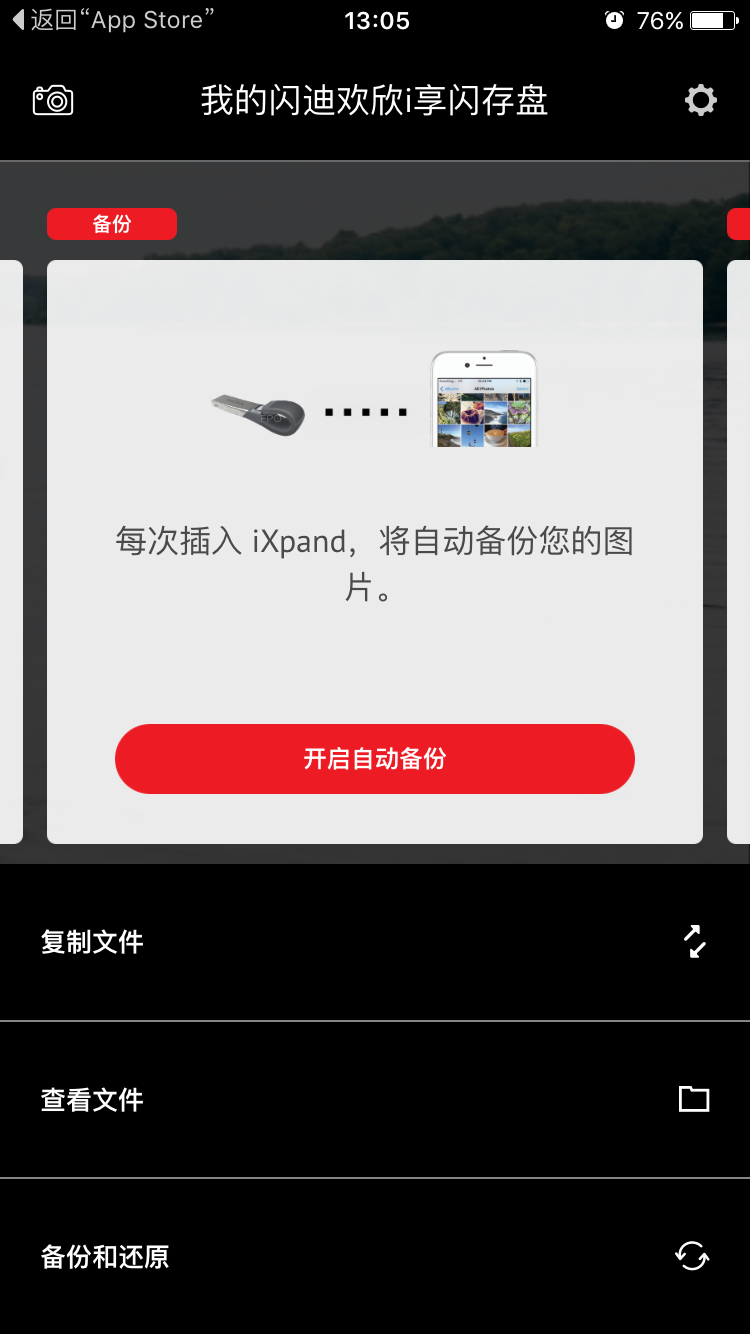 下載完成后我們插上閃迪第二代iXpand歡欣i享蘋果U盤,打開APP就會出現(xiàn)如下界面,主界面十分簡潔,上半部分是一些功能的快捷方式,如“備份社交媒體照片”,“自動備份”,“備份通訊錄”,“容量顯示”等等。