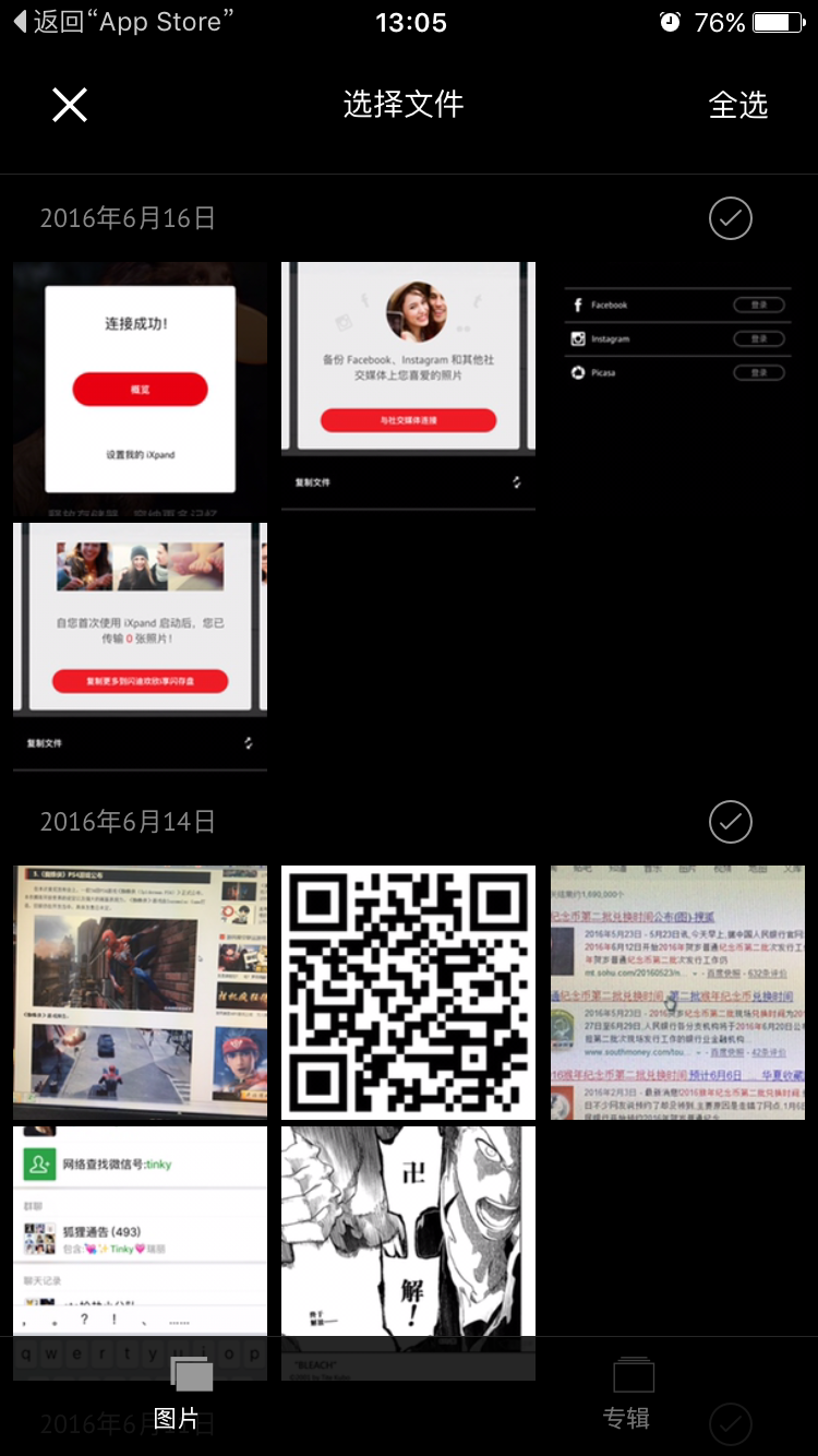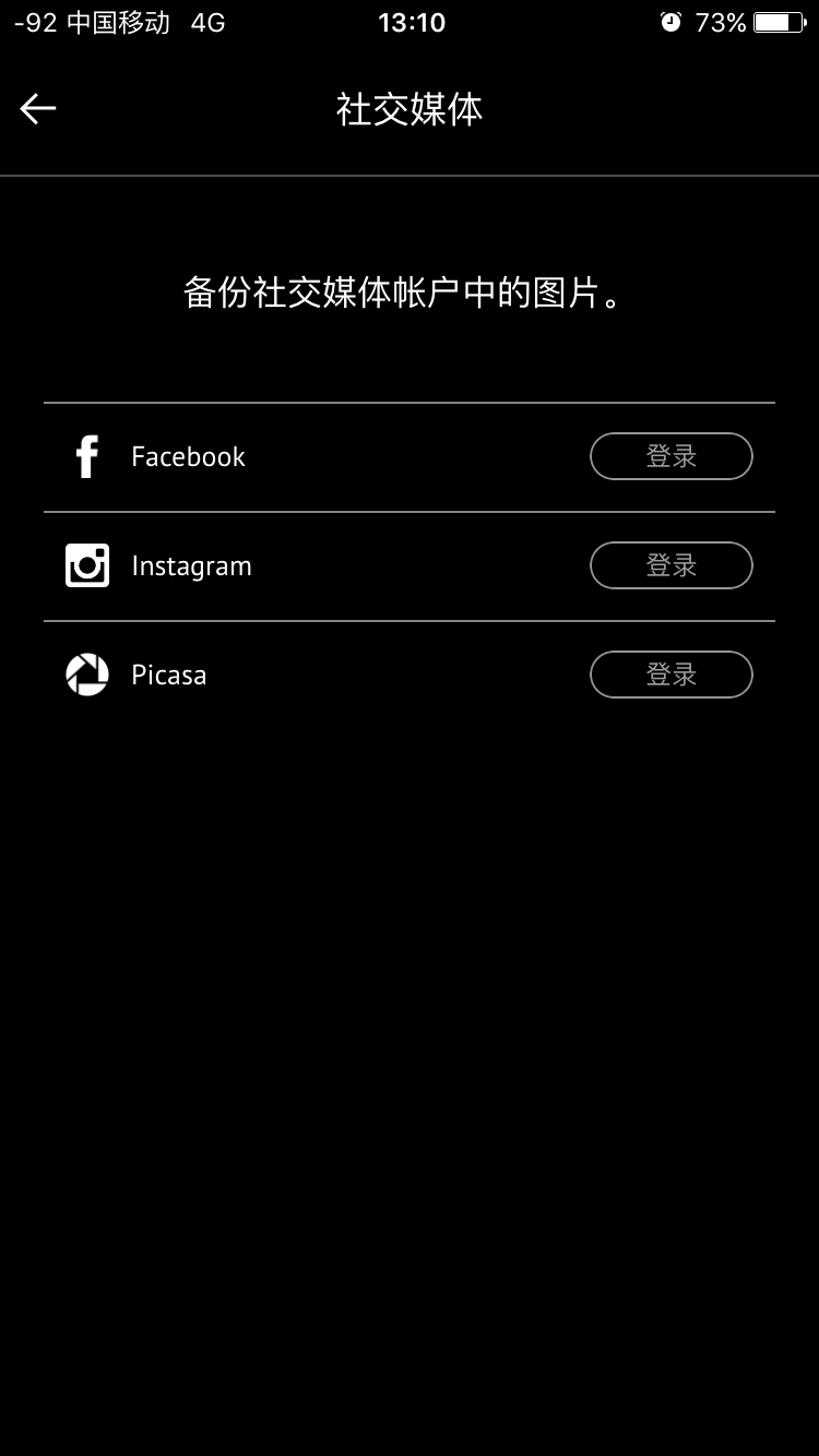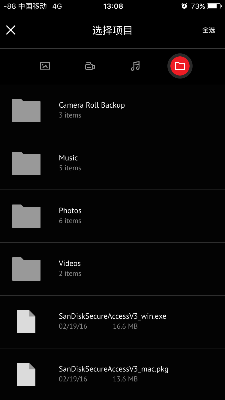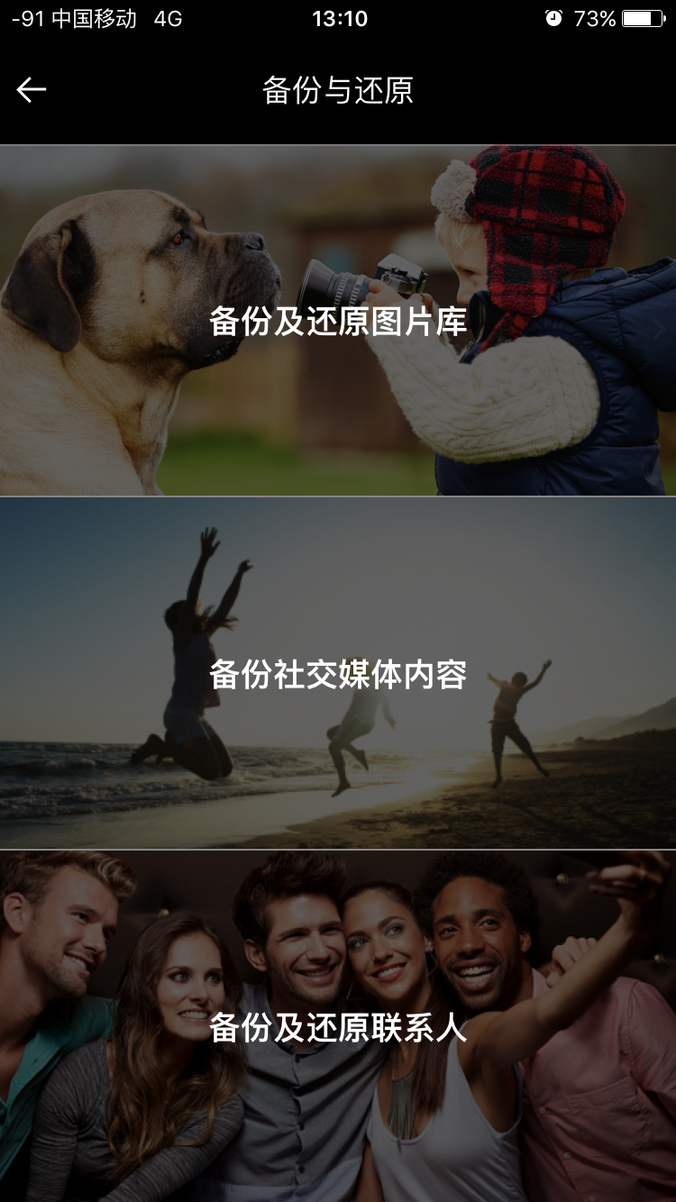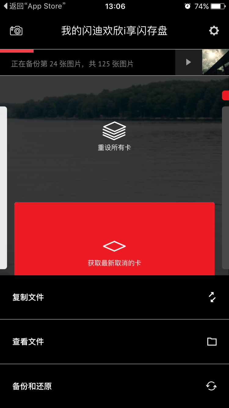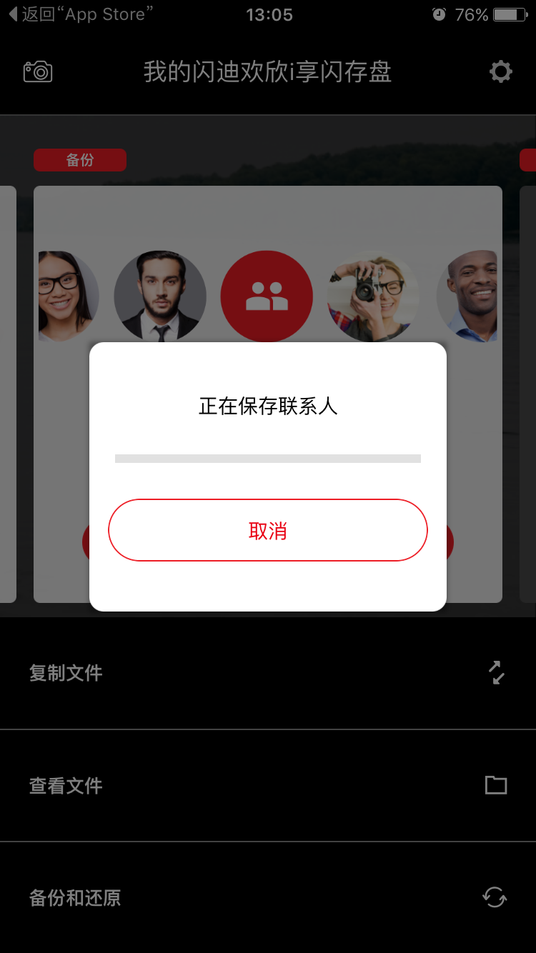 下載完成后我們插上閃迪第二代iXpand歡欣i享蘋果U盤,打開APP就會出現(xiàn)如下界面,主界面十分簡潔,上半部分是一些功能的快捷方式,如“備份社交媒體照片”,“自動備份”,“備份通訊錄”,“容量顯示”等等。