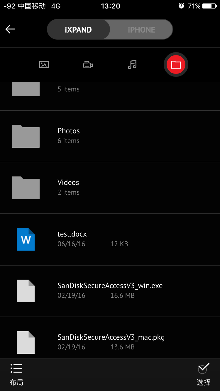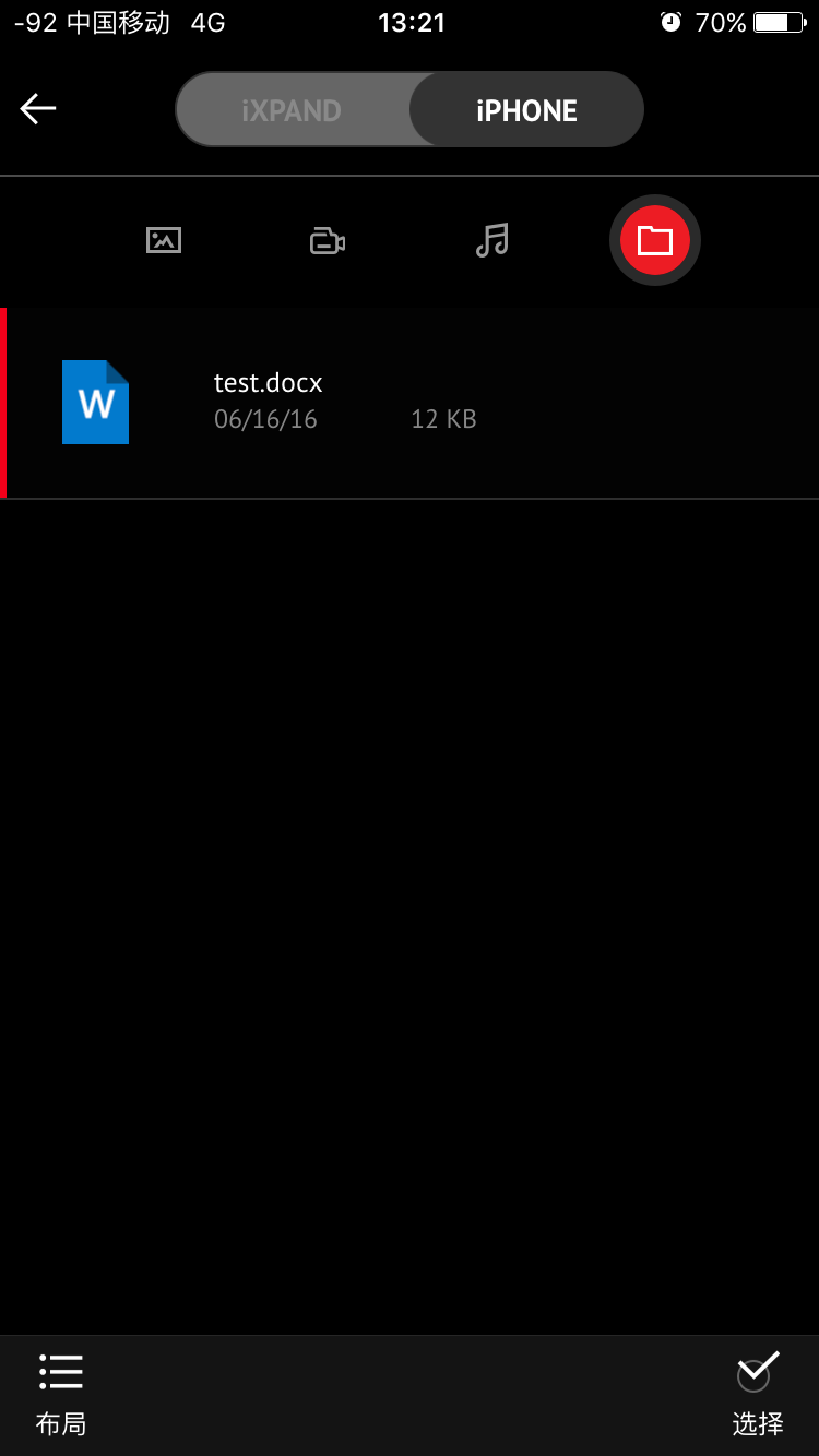選擇“查看文件”后會出現(xiàn)iXAND和iPHONE選項,小編把一個Word文檔復制到手機中,就可以在iPHONE中查看文檔內容,一些手機無法存放的格式都會被復制到這個位置。