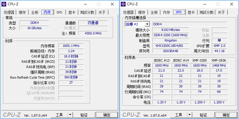 進入系統后,我們在CPU-Z中查看內存信息。16G套條組成雙通道,時序為CL 18-21-21-39。