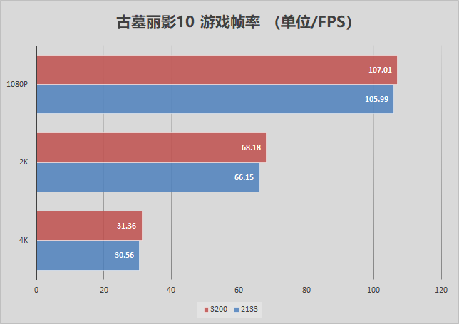可以看到,在采用DX12渲染的游戲《古墓麗影10》中,內存頻率對于游戲幀率的影響并不大,僅在1-2幀之內。