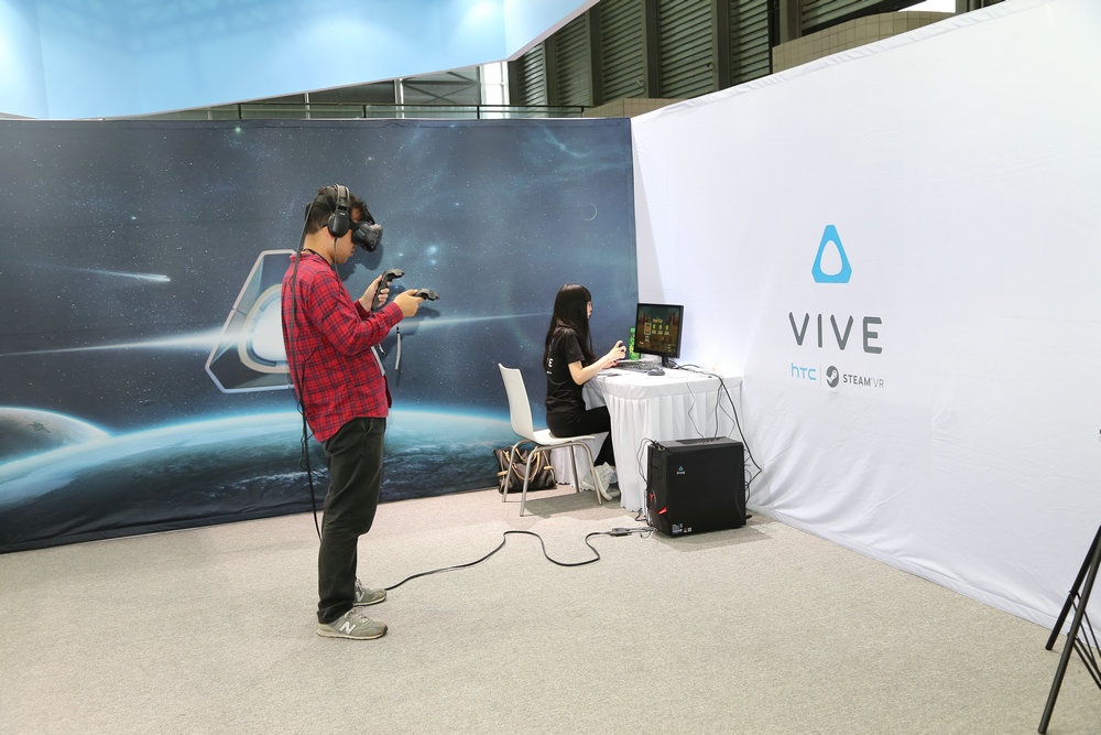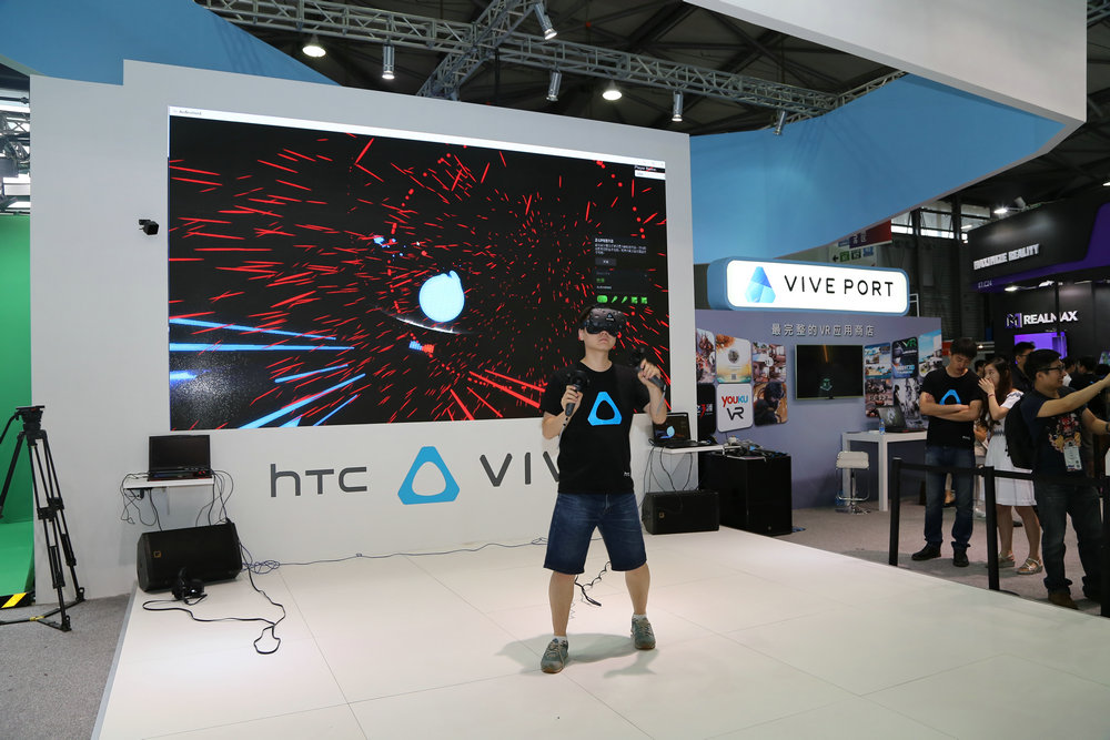 在主舞臺(tái)上,HTV的工作人員穿戴著HTC Vive正在玩游戲,吸引了許多觀眾駐足觀看。