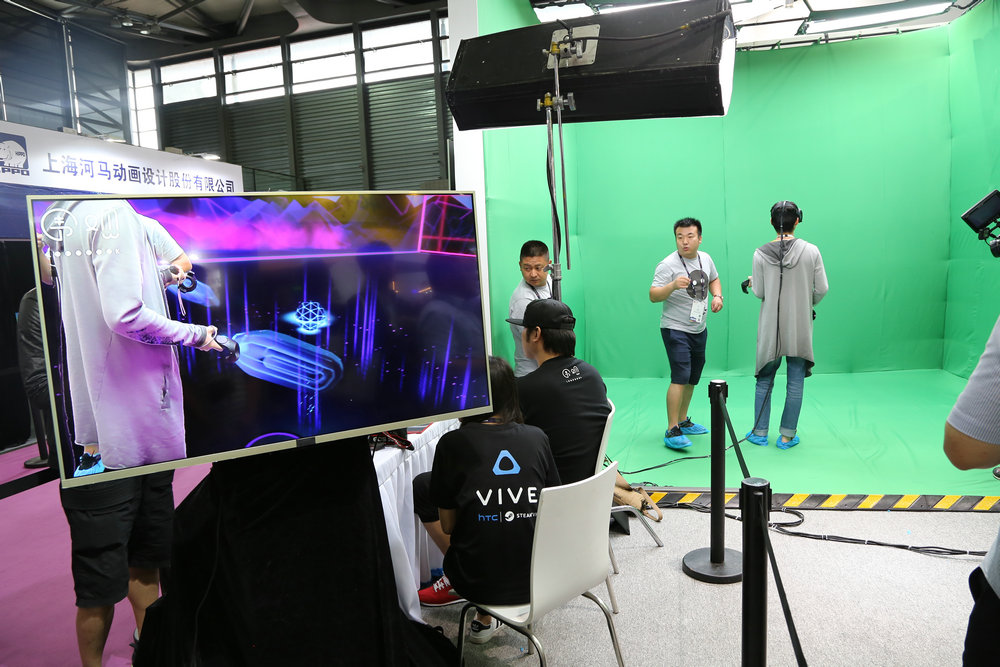 在展位的左邊,HTC設(shè)立了一個(gè)VR結(jié)合藍(lán)屏摳像的體驗(yàn)區(qū)域,體驗(yàn)者在體驗(yàn)VR的同時(shí)通過(guò)藍(lán)屏摳像技術(shù)把體驗(yàn)者直接合成到游戲中的場(chǎng)景,并且實(shí)時(shí)渲染出視頻,并通過(guò)U盤(pán)拷貝給體驗(yàn)者留作紀(jì)念。