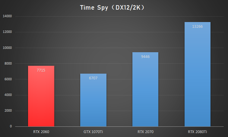 大概是因為DX12更加新一點的緣故,針對該環境進行測試的Time Spy渲染輸出分辨率起步便是2K,這其實也代表了新一階段顯示器分辨率的發展趨勢。RTX 2060在Time Spy項目中的得分為7715,比GTX 1070Ti還高了約1000分,為RTX 2080Ti的58%。